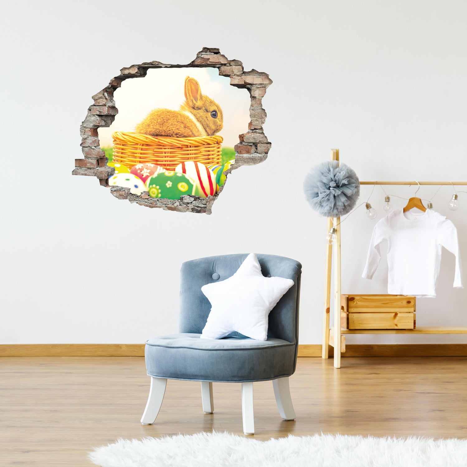 Holen Sie sich den Frühling und eine Extraportion gute Laune direkt nach Hause! Unser 3D-Wanddurchbruch mit Osterhasen-Motiv erzeugt eine charmante optische Täuschung: Es wirkt, als würde die Wand aufbrechen und ein neugieriger Osterhase direkt in Ihr Zimmer hoppeln.