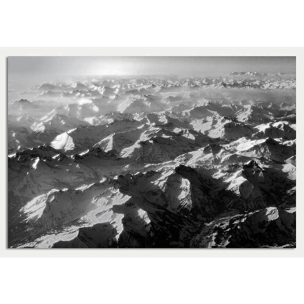 Our printed aluminum picture shows black and white mountains from above. High-quality aluminum provides a modern look and captures the majestic beauty of the mountain landscape.