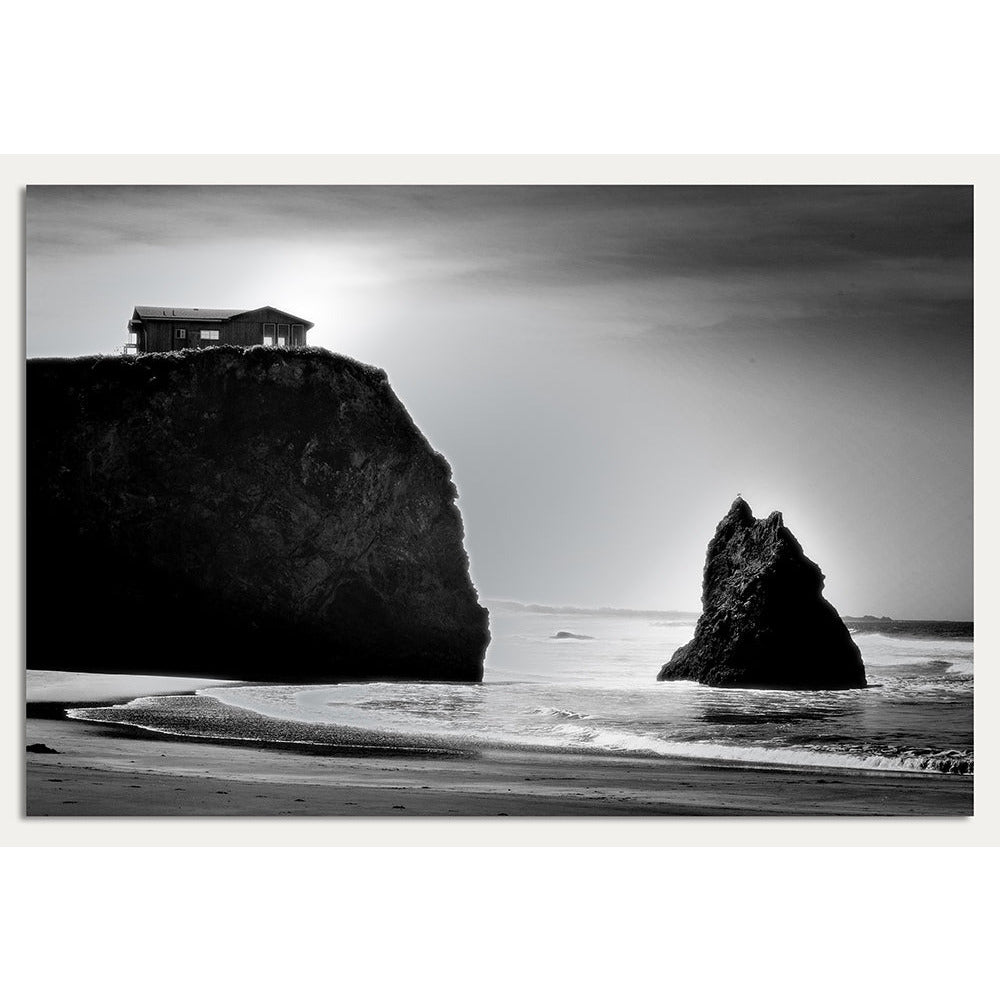 Our aluminum picture shows an idyllic hut on rocks, surrounded by roaring waves and the rushing sea. The black and white motif gives the picture a timeless elegance.