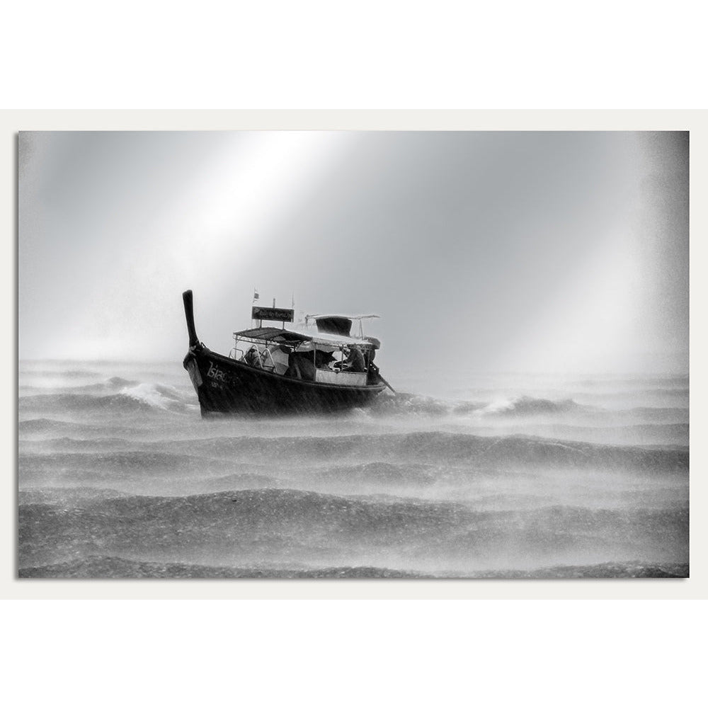 In the production of the Alu-Dibond wall pictures White areas are deliberately left out to create the metal effect . Our aluminum picture shows a boat in the stormy sea, surrounded by high waves and rain. The modern look enhances any room and inspires with the power of the ocean.