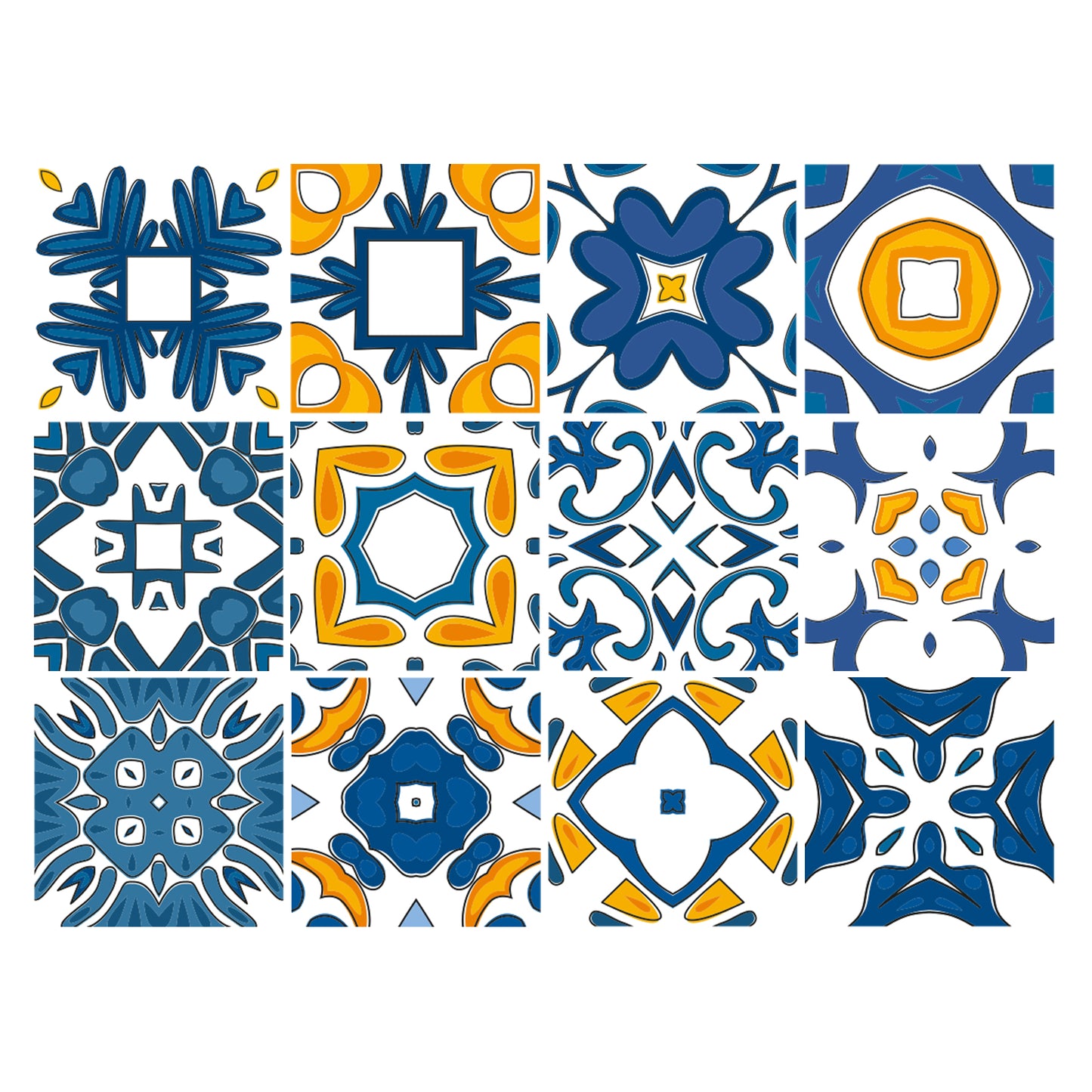 Our set of 12 printed sticker tiles in blue and yellow brings fresh patterns and shapes to your wall tiles. Self-adhesive and easy to apply, they give your kitchen and bathroom a new look in no time. The sticker tiles are also suitable for walls and can be completely removed to breathe new life into old tiles. Get ready to brighten up your rooms with these colorful and versatile stickers!